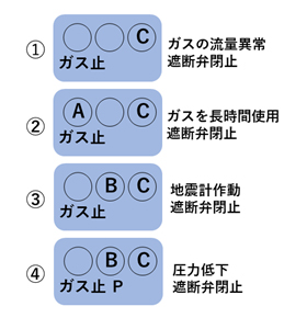ガス使用中に地震(震度5相当以上)の発生や、風や接触などによる強い振動が起きた場合、または警報器が作動した場合、ガスメーターが自動的にガスを遮断します。液晶パネルには「BC ガス止」と表示されます。