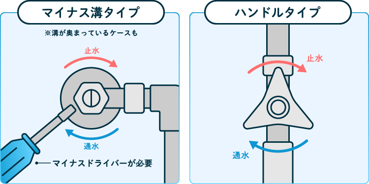 止水栓は便器の横や後ろにあり、形状はハンドル式とドライバー式の2種類があります。